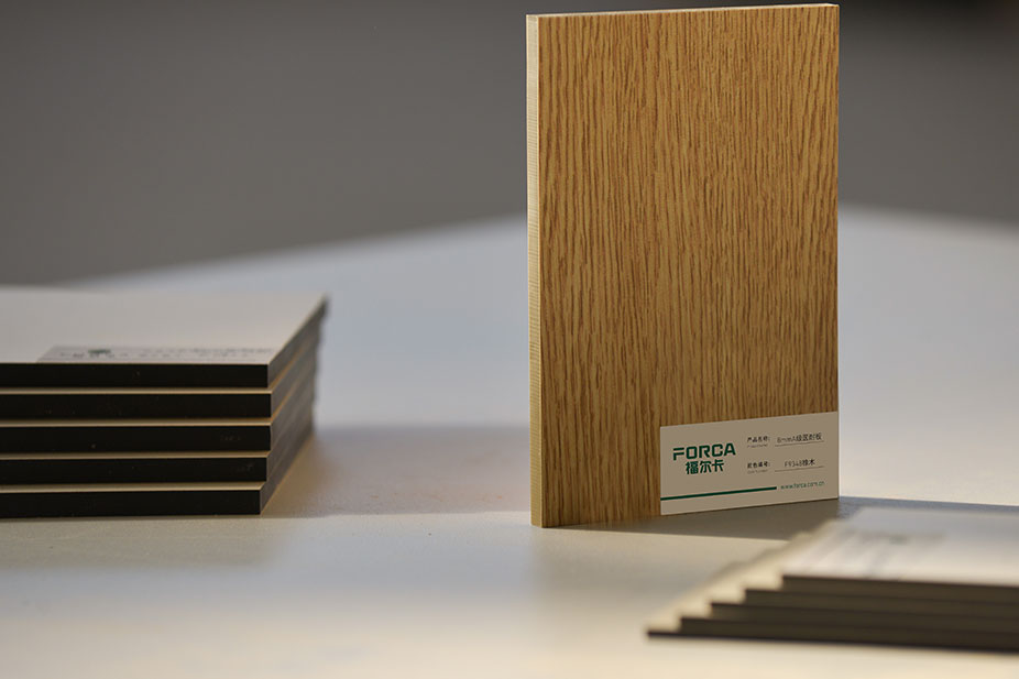福爾卡·抗倍特板(纖維樹(shù)脂板)是由裝飾色紙含浸三聚氰胺樹(shù)脂,加上多層黑色或褐色牛皮紙含浸酚醛樹(shù)脂層疊后,再用鋼板經(jīng)由高溫(150° C)高壓(1430psi)的環(huán)境壓制而成,產(chǎn)品密度不低于 1450KG/m',厚度從 1.5mm 到 25mm 皆可制作。酚醛樹(shù)脂纖維板依其表面色紙層,可滿足多種花色選擇,單面或雙面的裝飾需求。
